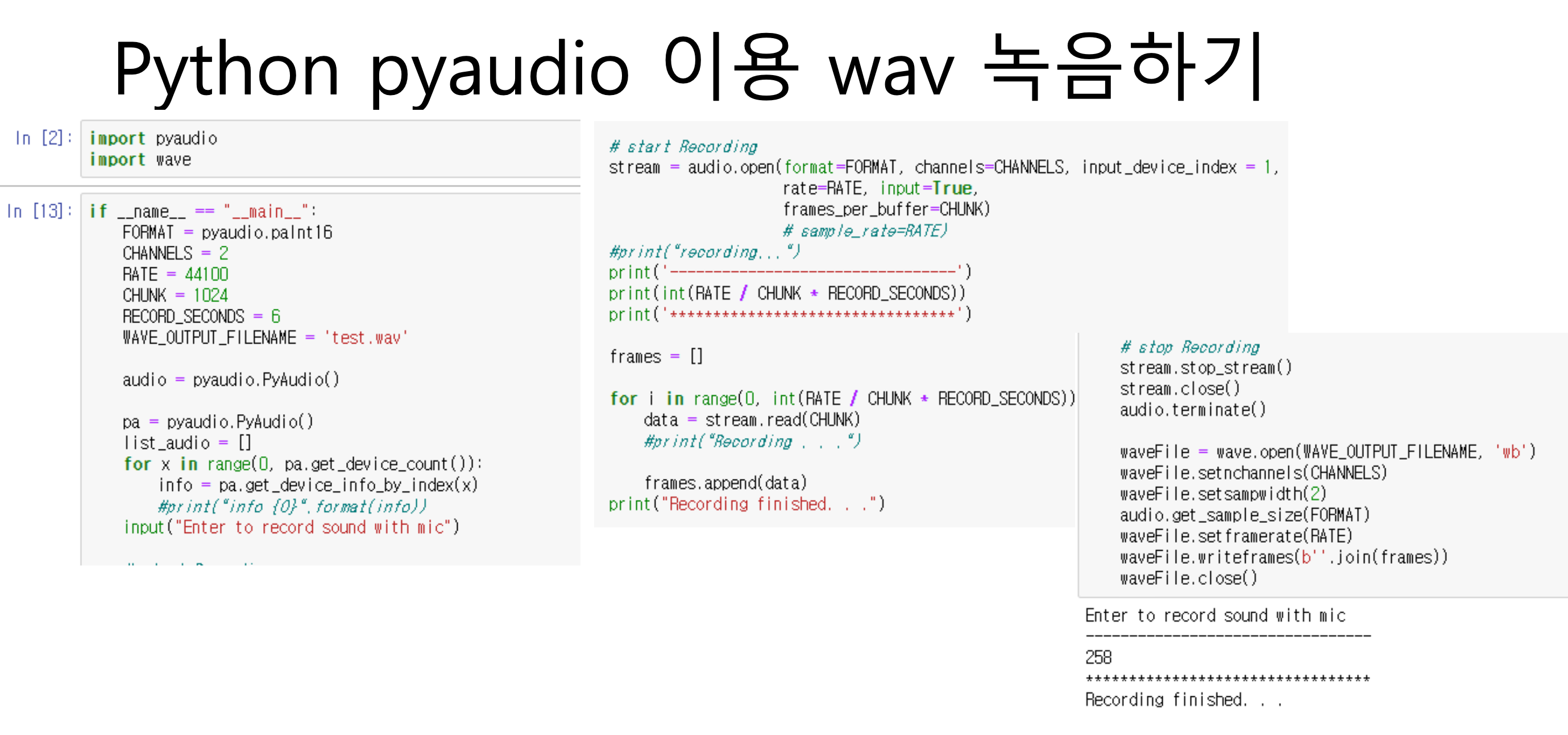 예시로, python 의 pyaudio 를 사용하여 소리를 녹음하는 것에 대해 살펴봅시다.