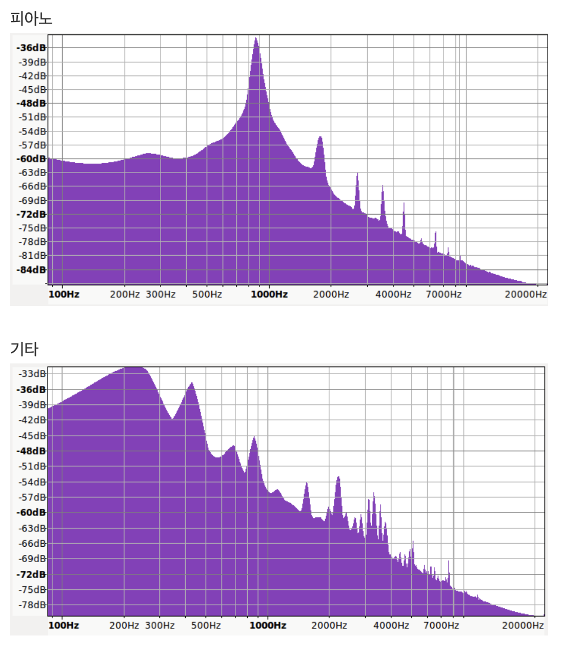 하지만 피아노, 기타와 같은 악기로 같은 "도(C)" 음을 발생시켰을 때 우리는 이것이 도의 음높이를 가진다는 것도 알 수 있지만 이 소리가 기타의 소리인지 피아노의 소리인지도 구분할 수 있습니다. 이것이 가능한 이유는 기타가 발생시키는 파형과 피아노가 발생시키는 파형이 서로 다르기 때문입니다.