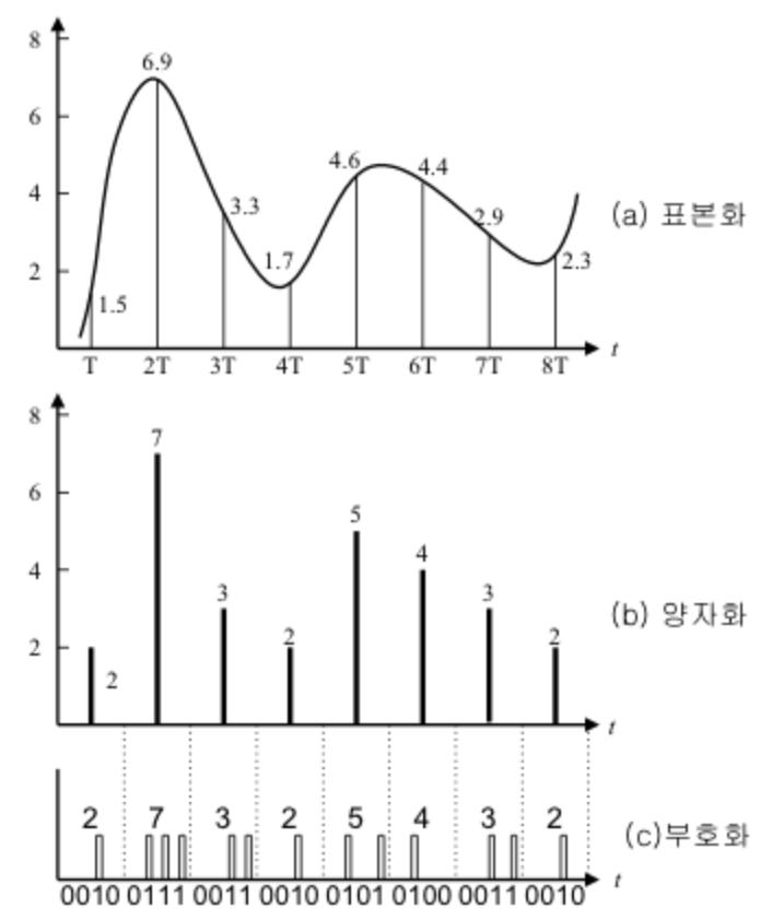 이렇게 앞에서 설명한 것처럼 아날로그 신호가 디지털 신호로 변환되어 전송될 수 있습니다.