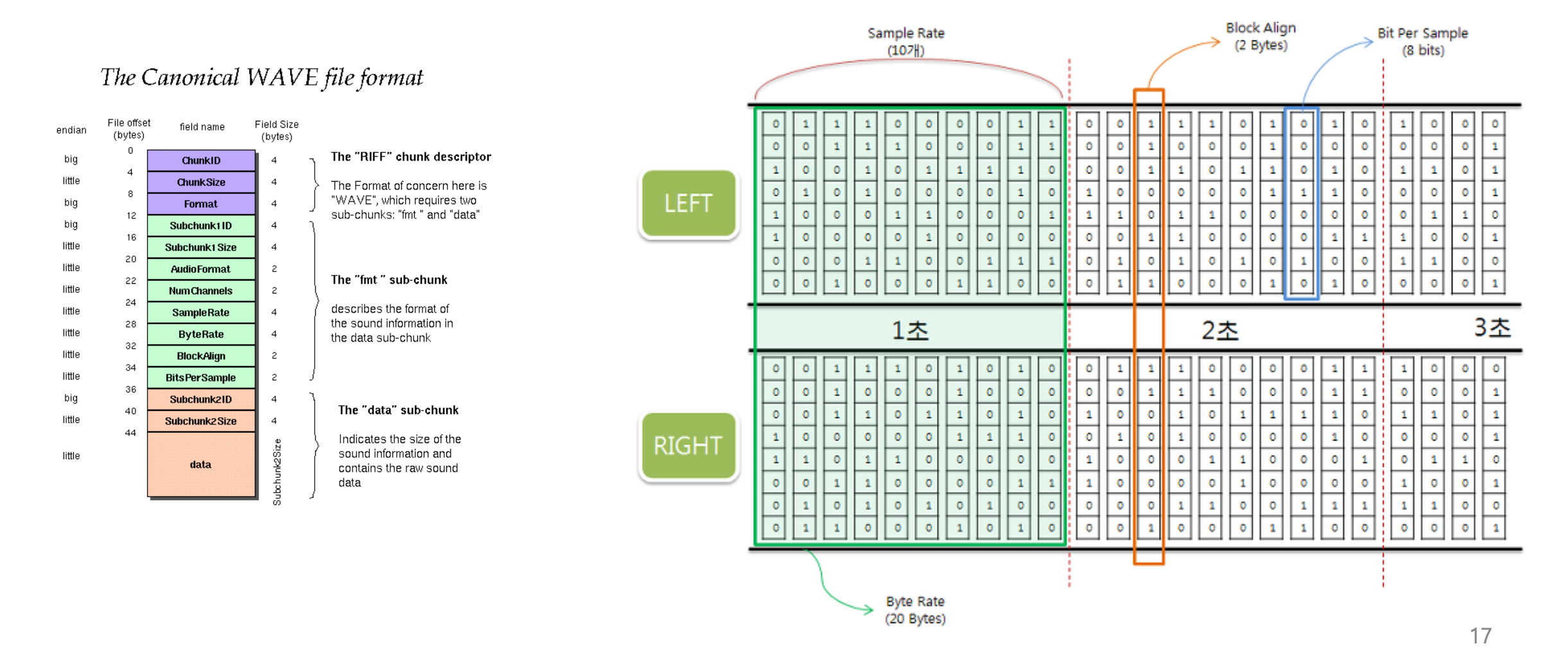 다음 그림을 보며 wav 파일의 구조와 sampling rate, bit per sample, bit per sec 에 대해 알아봅시다.