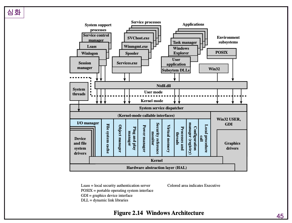 윈도우즈는 MicroKernel 구조로 구현된 운영체제입니다. 지금은 많은 부분이 커널 안으로 들어가 모놀리식과 현저하나 차이가 없지만 기본적으로 마이크로 커널 구조의 컨셉을 따릅니다. 몇가지 System Support 기능과 서비스 기능 등이 User-Mode (OS 밖, 즉, OS 위에서 돌아가는) Process 로 구현되어 있습니다.