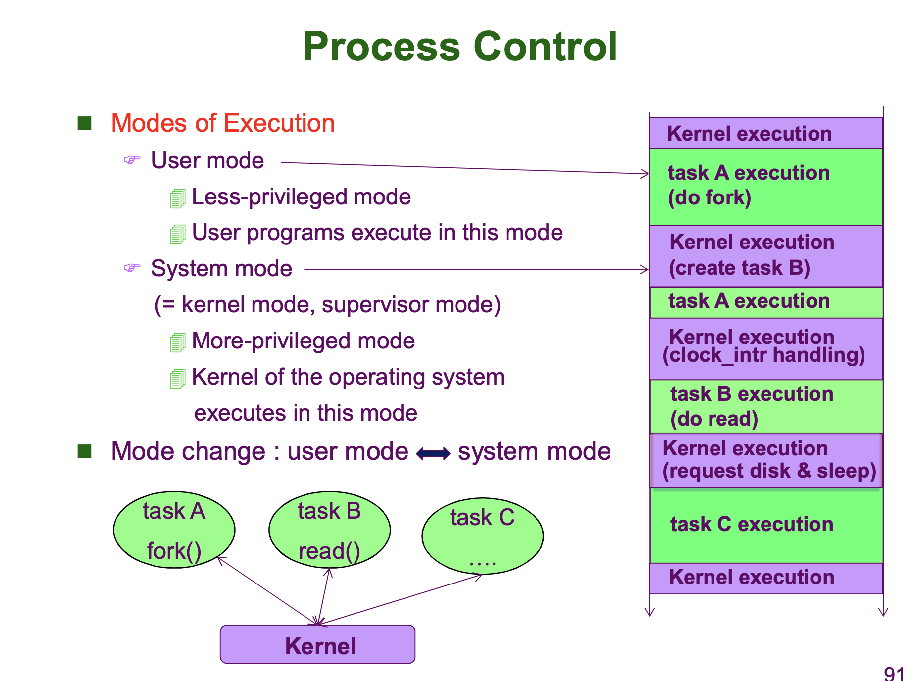 Process Control 프로세스의 제어는 두가지 Mode 에서 일어납니다. 하나는 User Mode 이고 다른 하나는 System Mode 입니다. 유저 모드는 유저 컨텍스트에서 동작하는 시간을 이야기하고 System Mode 는 시스템 컨텍스트에서 동작하는 시간을 이야기합니다.