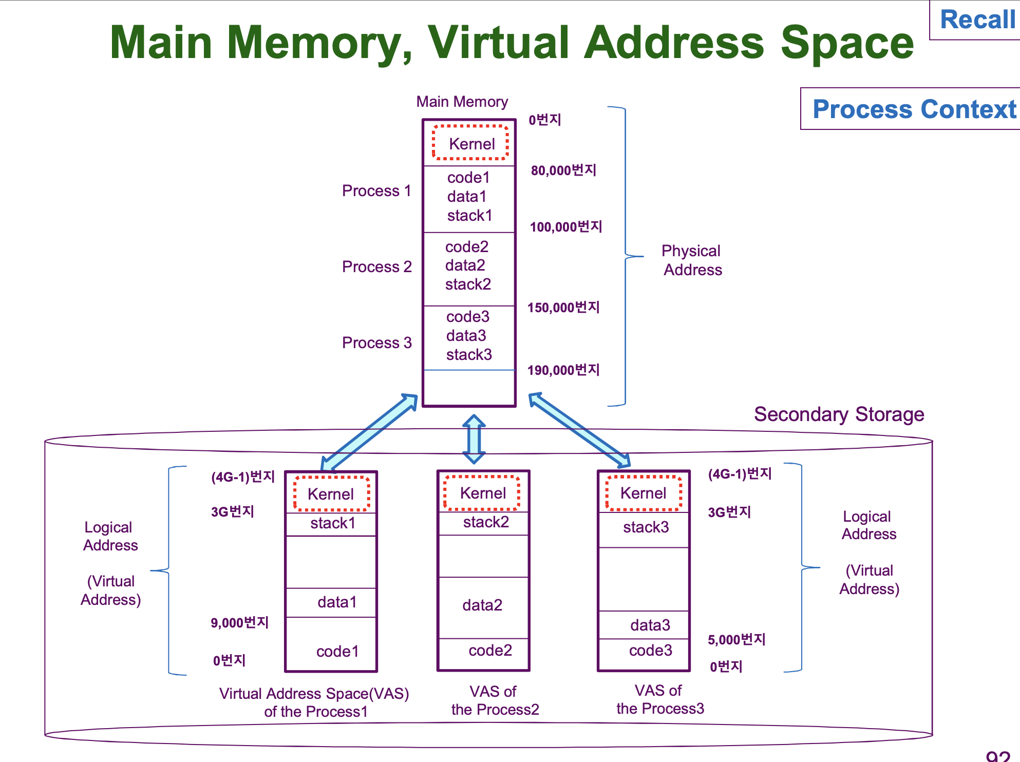VAS 관점에서 CPU 가 code1 에 있는 Instruction 을 수행하다가 Interrupt 에 의해 'VAS of Process 1 의 Kernel' 에 있는 System Call 을 호출합니다. 그리고 Context Switching 작업을 거치며 'VAS of Process 2의 커널'이 Process2 의 PCB 로부터 Context 를 가져오고 code2 의 인스트럭션들을 수행합니다.