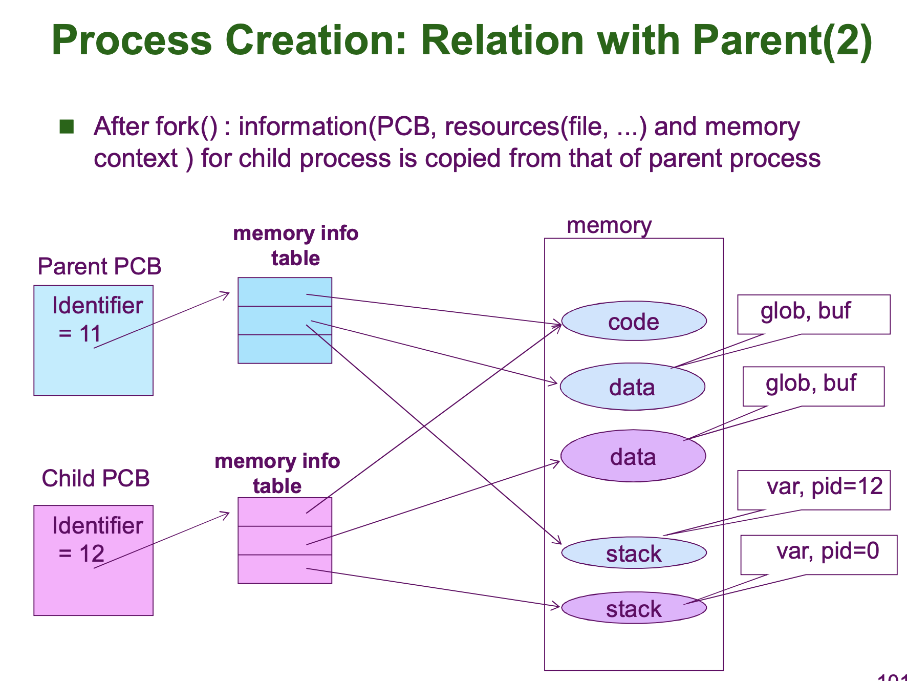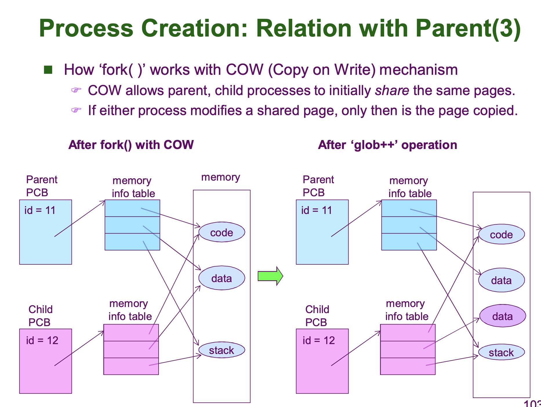 COW 방식에 대한 설명 COW 방식은 fork 직후 자식 프로세스가 Main Memory 상의 부모 프로세스의 User Context 를 그대로 가리키고 있게합니다. 그리고 부모 프로세스와 자식 프로세스 둘 중 어떤 프로세스가 새로운 작업을 하게 되면, 그제서야 자식 프로세스만의 User Context 를 Main Memory 상에 복제하여 올리는 것입니다. (COPY ON WRITE)