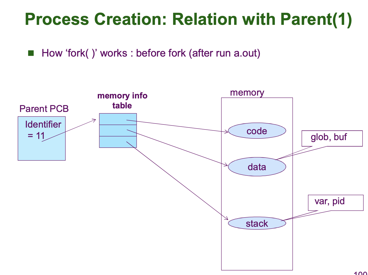 먼저 위 그림과 같이 fork (자식 프로세스를 생성하는 명령) 하기 전에 부모 프로세스가 있다고 생각해봅시다. PCB 안에는 프로세스 컨텍스트가 가지고 있는 code, data, stack 블럭의 시작과 끝 주소를 pointing 하는 정보가 들어있습니다.
