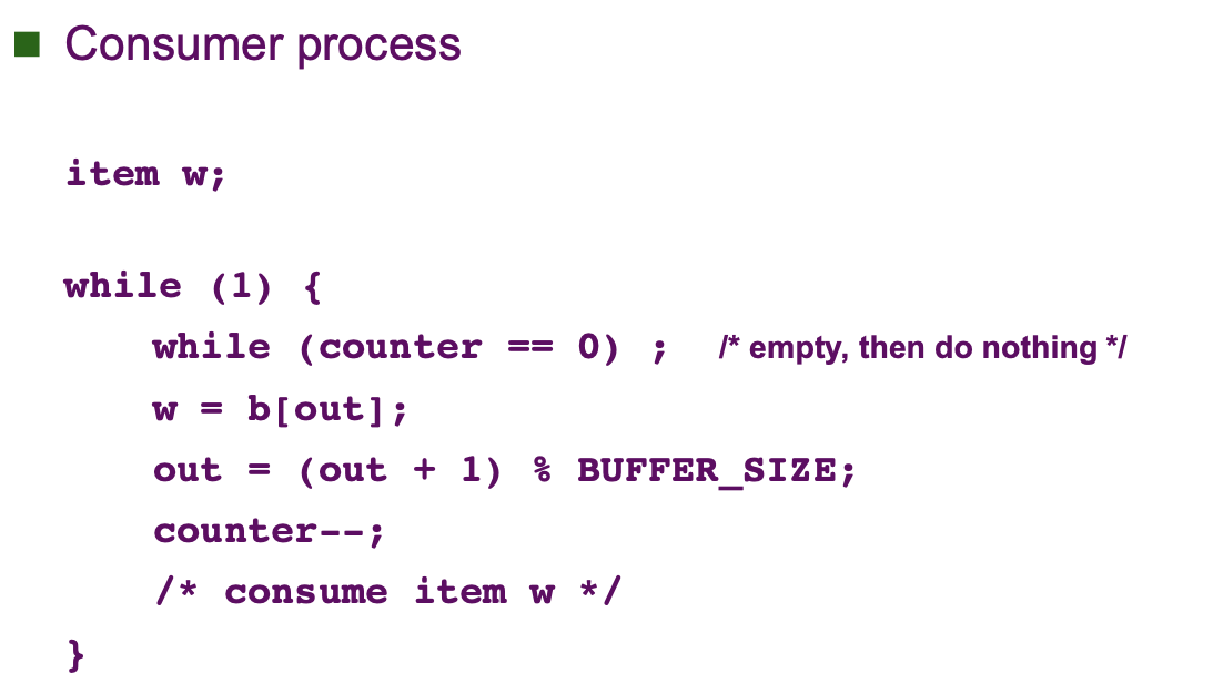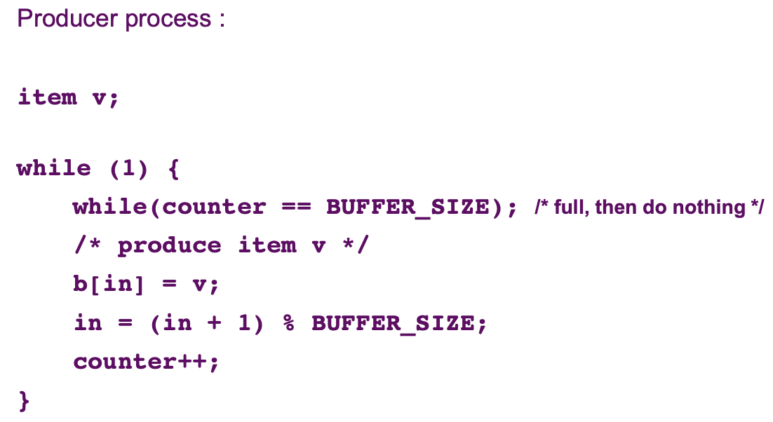 Race Condition in Uniprocessor 위와 같이 Producer 와 Consumer 라는 프로세스가 동작하고 있다고 가정합시다. 이 때, Counter 라는 전역변수를 이용하여 버퍼안에 몇개의 Item 이 들어있는지 셀 수 있습니다. 즉 Buffer 와 Counter 는 shared resource 가 됩니다. Producer 와 Consumer 프로그램의 코드는 아래와 같습니다.