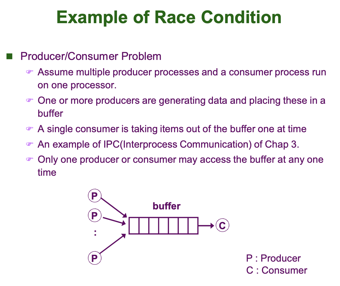 - Critical Section : A section of code within a process that requires access to shared resources and that may not be executed while another process is in a corresponding section of code. Only one program at a time is allowed in its critical section.