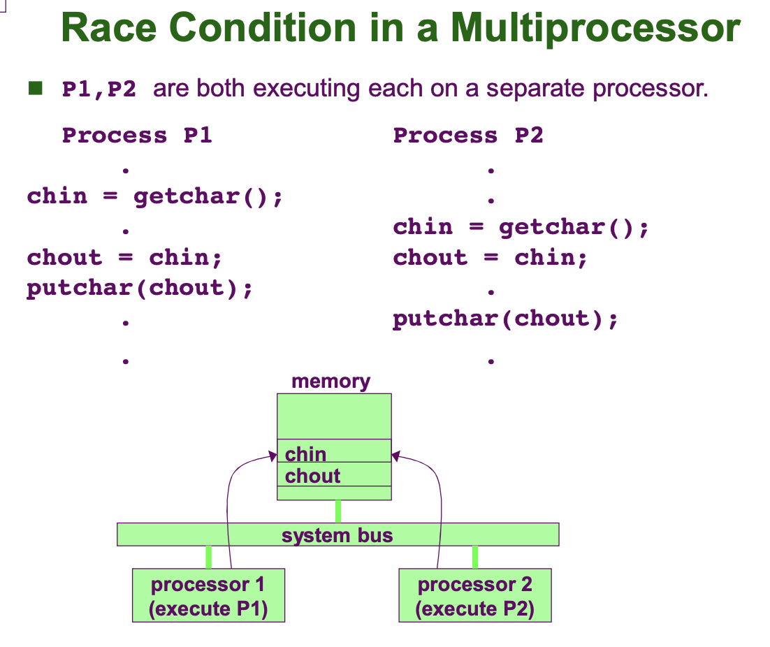 P1 이 chin 에 getchar() 를 통해 문자하나를 저장합니다. 이 Instruction 직후 concurrent 하게 프로세스가 실행되고 있으므로, P2 에서도 chin = getchar() 가 수행된다고 합시다. 그러면 chout 에는 P2 의 getchar() 에서 입력받은 문자가 저장되게 되고 P1과 P2 의 putchar(chout) 에서 모두 P2 에서 입력받은 getchar() 값이 출력이 됩니다.
