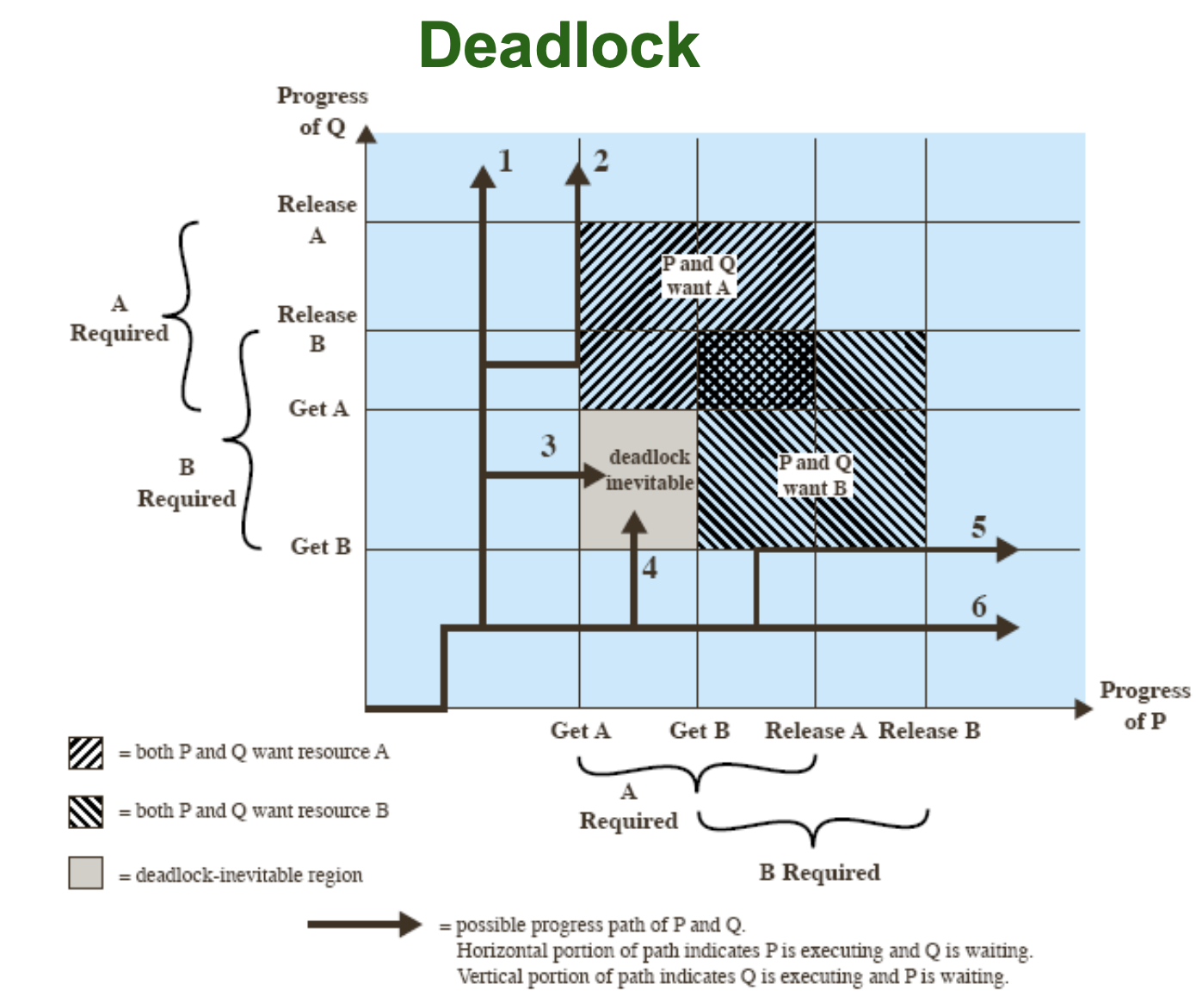 가능한 상황들 회색 구역으로 진입하는 3, 4 번의 flow 는 deadlock 입니다. 서로가 서로에게 필요한 자원을 점유하고 있기 때문에 시간이 흐르더라도 각 프로세스는 더이상 진행할 수 없습니다. 그 외의 1,2,5,6 의 상황은 각 프로세스가 원하는 자원을 즉시 받지 못할 뿐, 기다리면 다시 자원을 받을 수 있는 정상적인 block 상태입니다.