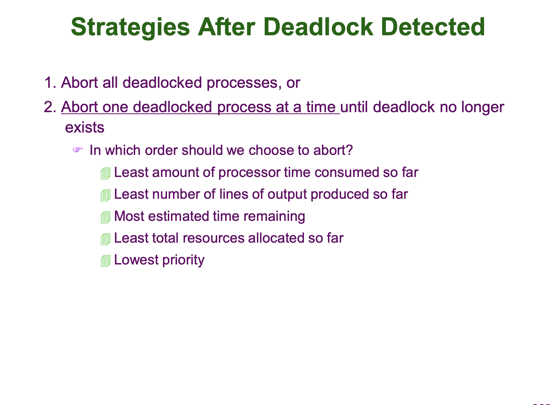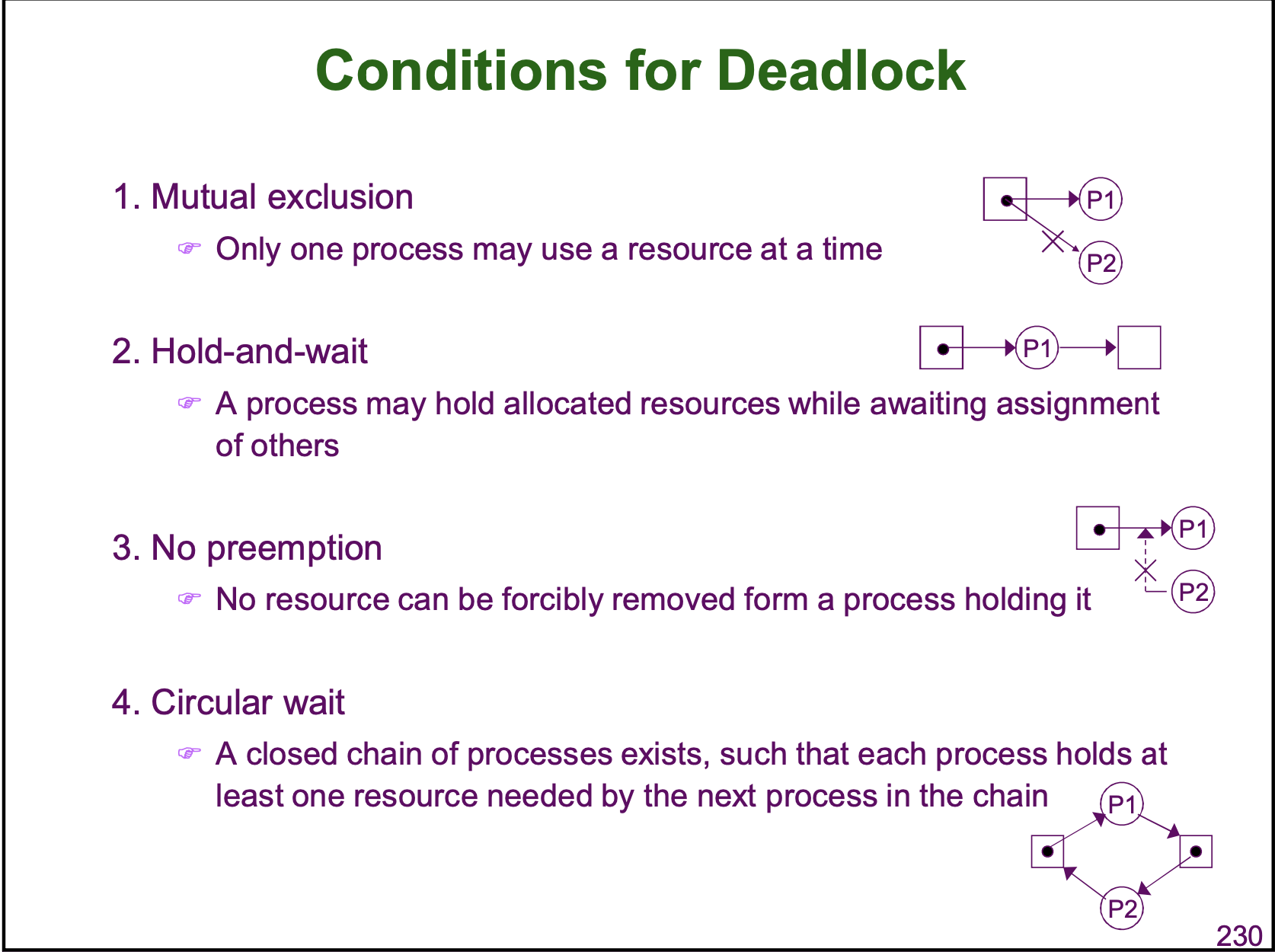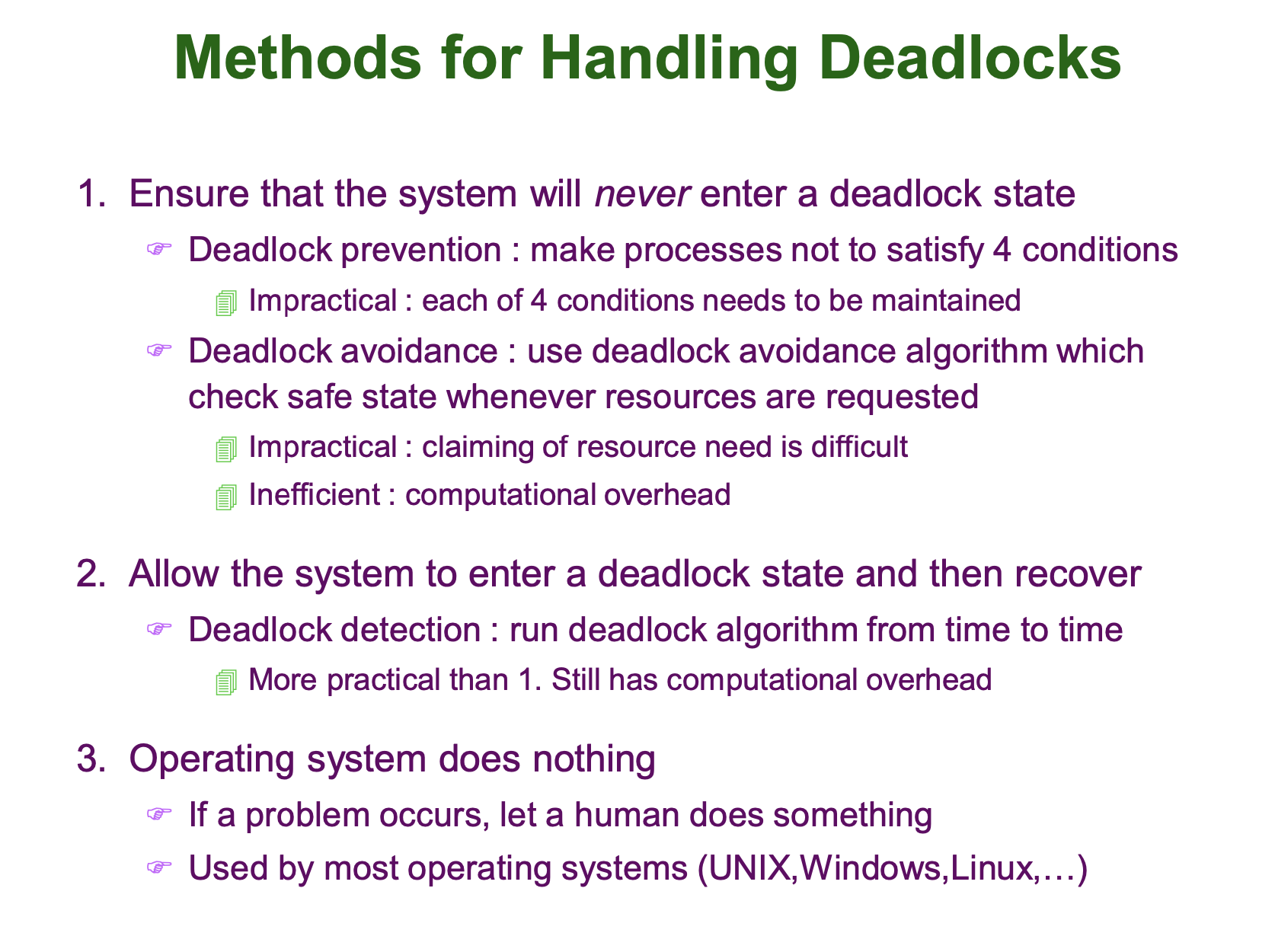 이 외에도 Banker's Algorithm 등을 통해 데드락이 일어나지 않도록 프로세스를 운용하는 방법이 있지만, overhead 가 크거나, utilization 을 떨어뜨리거나, 특정한 제약 조건 내에서만 쓸 수 있는 한계로 인해 잘 사용하지 않습니다.