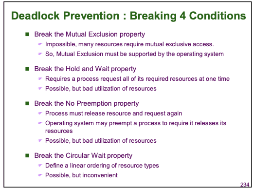 데드락을 예방하거나, 데드락에서 복구하거나, 아무것도 하지 않거나 먼저, 데드락을 예방하는 방법부터 알아보겠습니다. 앞서 나와있듯이 이 방법은 Computational Overhead 가 커서 사용하지 않습니다.