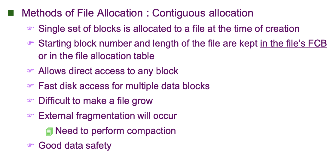 하지만, 외부 단편화가 생기고, File 크기가 커질 때의 관리의 어려움의 이유로 실용적이지 못합니다.
