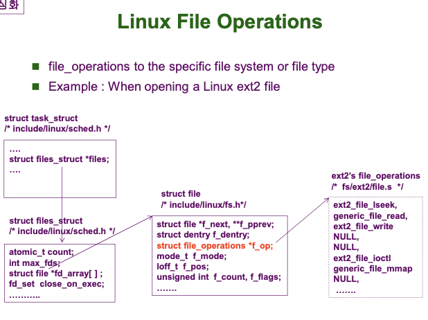 일종의 Adapter 디자인 패턴을 적용하여 다양한 File System 에 대해 File Operation 을 수행할 수 있다. 또 모듈 형식으로 이루어져있기 때문에 사용하지 않는 것은 빼고, 새로 사용할 파일 시스템에 대한 정보를 추가하기에 용이하다. 리눅스의 inode 구조, 12개의 direct block 과 3개의 indirect 블럭을 가지고 있음. Linux File Operation. System Call 에 의해 수행되며, Linux Virtual File System 에 의해 File System 에 맞는 방법으로 파일을 읽기/쓰기하여 File Operation 을 수행함. FCB 에 File Operation 에 대한 자료도 들어있었다! 예를 들어, 특정 파일이 ext2 File System 에 저장된 파일이라면 이 파일의 FCB 의 file operation 자료는 ext2 file operation 을 가리킨다. task_struct (PCB) 에 files_struct 포인터가 있고 이것은 File Descriptor 들을 할당받음. 그리고 File 이라는 구조체를 통해서 특정 파일의 File Operation 을 수행할 수 있음. 이를 통해 다양한 File system 을 Support 할 수 있음. '운영체제' 카테고리의 다른 글