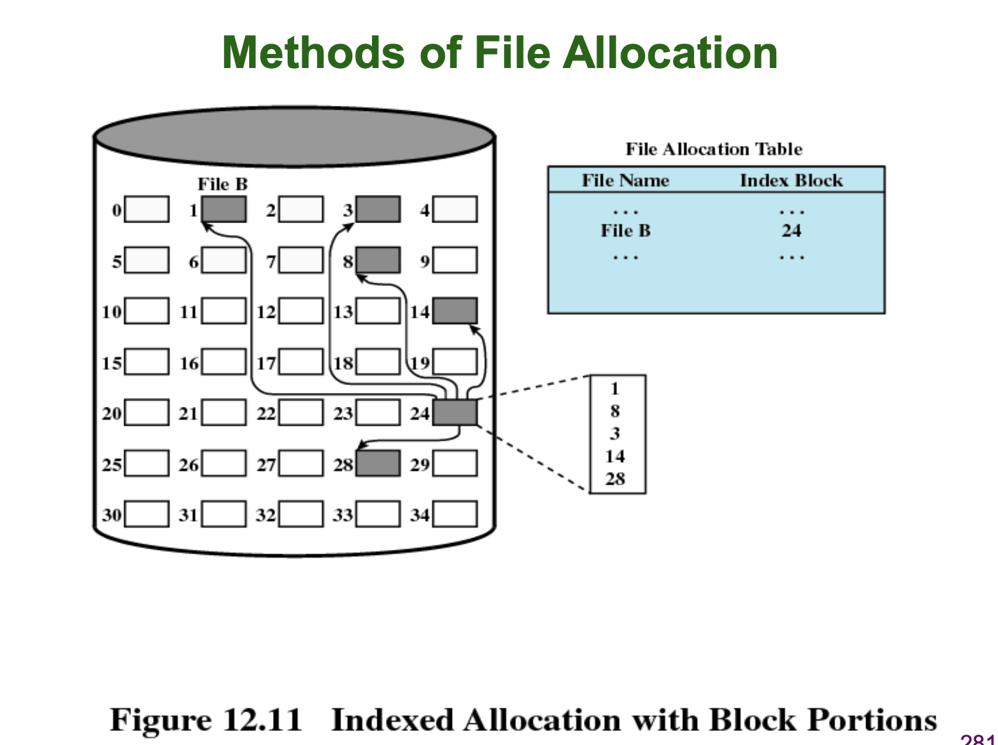 인덱스 블럭 내에 파일을 저장하고 있는 데이터 블럭들의 번호들을 파일의 내용 순서대로 나열하여 저장합니다. 그리고 FCB 혹은 File Allocation Table 에는 이 인덱스 블럭 (데이터 블럭) 의 식별자를 저장합니다. 이 방식은 Direct Access 가 가능하고, External Fragmentation 도 없습니다. 파일의 크기가 커지더라도 Free Block 을 추가로 할당하여 Index 블럭에 해당 Free Block 의 번호만 추가해주면 됩니다.