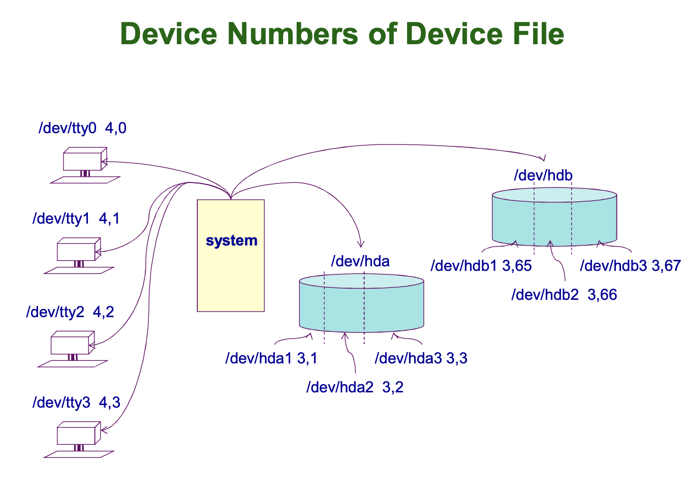 tty(teletype)과 disk device. 그리고 device file 위 그림에서 hda 를 살펴보면, 하드 디스크(hda)가 System(본체)에 연결되어 있습니다. hda 는 hda1, hda2, hda3 로 파티셔닝 되어 있는 상태입니다. 이러한 상태를 아까 위의 그림과 같이 device file 로 추상화 하여 관리하고 있습니다.