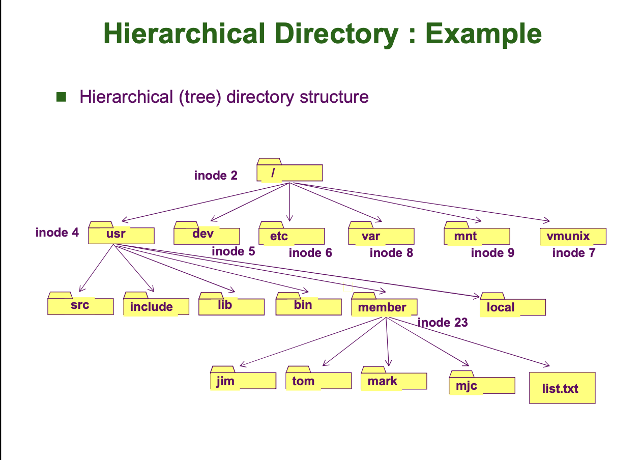 구체적 예시를 들어 위 계층적 디렉토리 구조에서 open("/usr/mem/list.txt", O-RDWD) 로 파일을 open 한다고 합시다. (RD,WD 는 read, write 을 의미) 그렇다면 OS 는 root 디렉토리의 FCB (inode 2) 를 읽고 root 디렉토리가 저장된 data block 의 위치를 알아내 root 디렉토리에 어떤 내용 (포함하고 있는 inode number 와 파일 이름) 을 담고 있는지 확인합니다. 그리고 root 디렉토리의 하위 디렉토리로 usr 가 존재하는지 확인하고 usr 가 존재하면 usr 의 FCB 를 읽고 usr 하위에 member 디렉토리가 있는지 확인하고 ... 의 과정을 수행하는 것입니다.