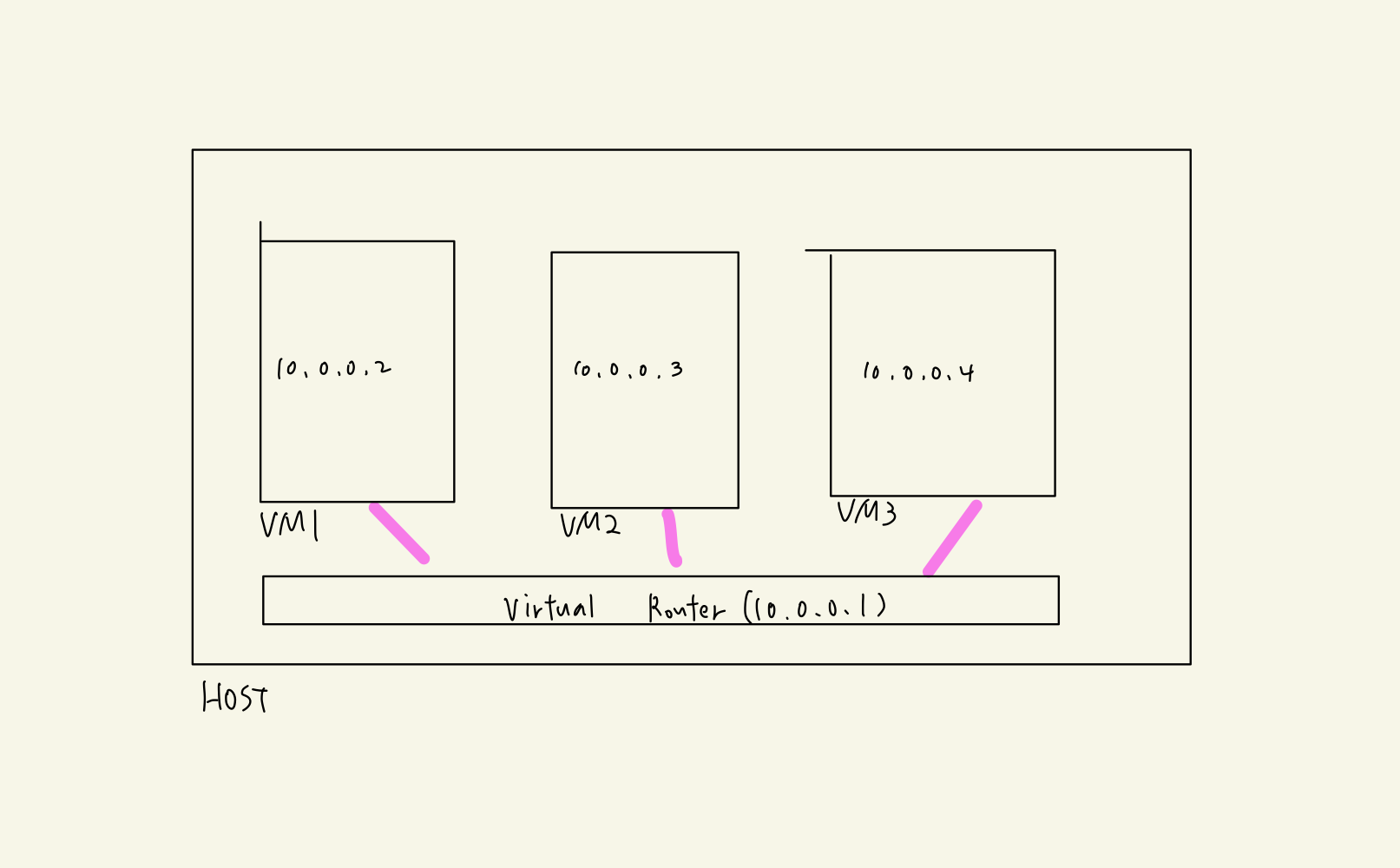 NAT Network 방식으로 가상머신 네트워크를 구성한 형태. 이상으로 Virtual Machine 을 생성할 때 네트워크를 구성하는 방법에 대해 알아보았다. 최근에는 도커를 사용할 일이 잦은데 도커에서는 Overlay 라는 네트워크를 보았는데, 이에 대해서는 추가로 정리해볼 계획이다.