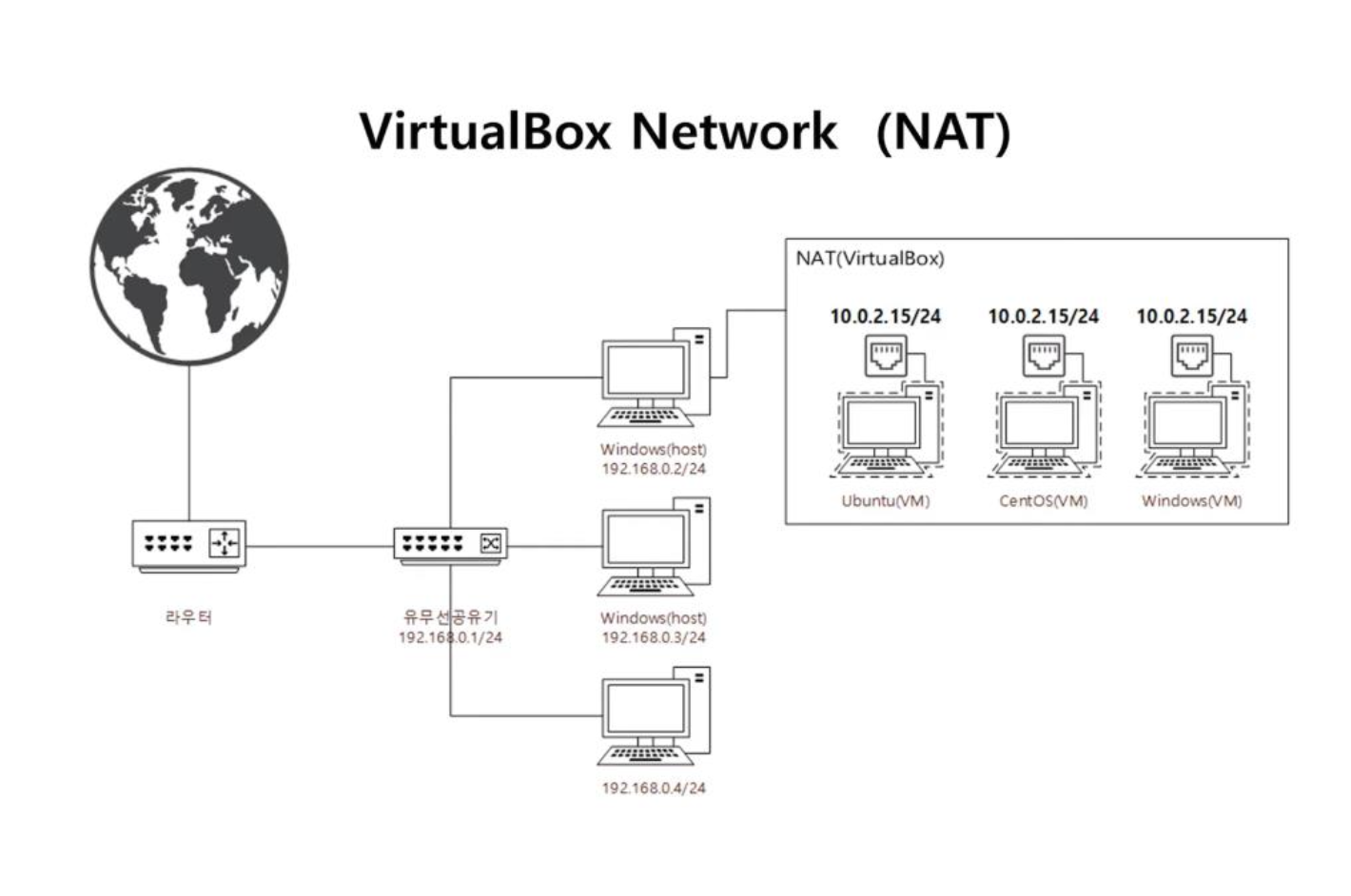 NAT Network 방식은 NAT 방식과 유사하나, 하나의 NAT 를 여러 가상 머신이 공유한다는 점이 다르다. 공유기 한 대에 여러개 컴퓨터가 몰려있는 형태를 호스트 OS 안의 가상머신에 적용한 것과 유사하다.