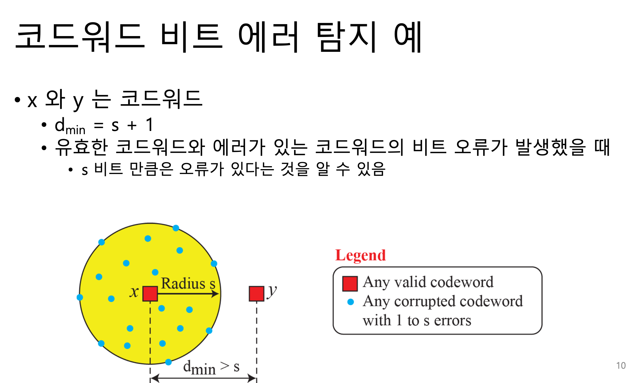 해밍 코드로 비트 오류를 "탐지" 하기 위한 조건 해밍 코드를 이용해 비트 오류를 탐지하기 위해서는 위와 같은 조건이 요구됩니다. 그림에 대한 부연설명을 조금해보면, 유효한 코드워드 사이의 해밍 거리가 s+1 일 때, s 개의 오류를 탐지할 수 있다는 것입니다.