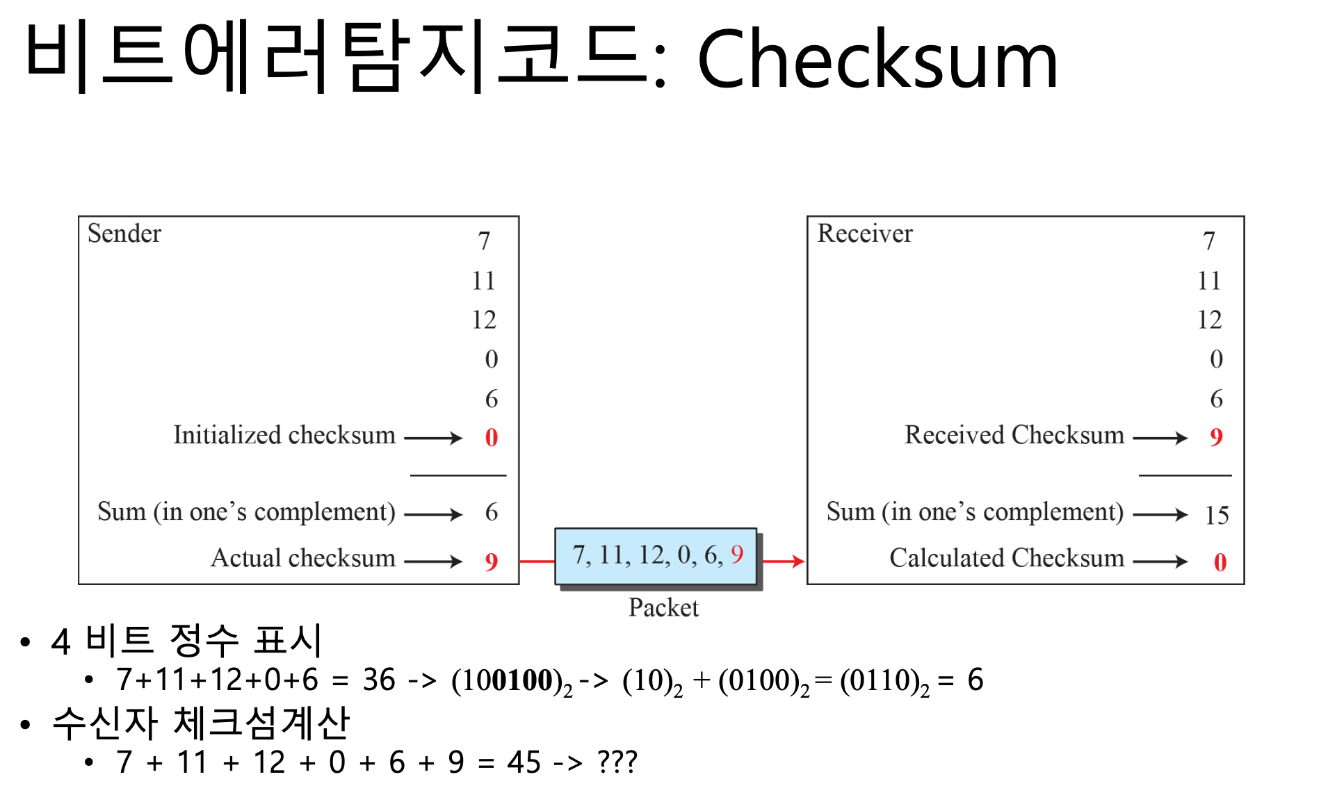 송신측에서 Checksum 을 데이터워드 뒤에 붙여 코드워들 생성해 전송합니다. 수신측은 동일한 방법으로 체크섬을 계산하고 계산된 체크섬 값이 0 이 아니면 오류가 발생했음을 "탐지" 할 수 있습니다.