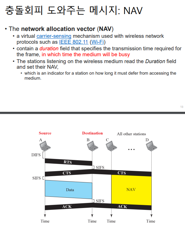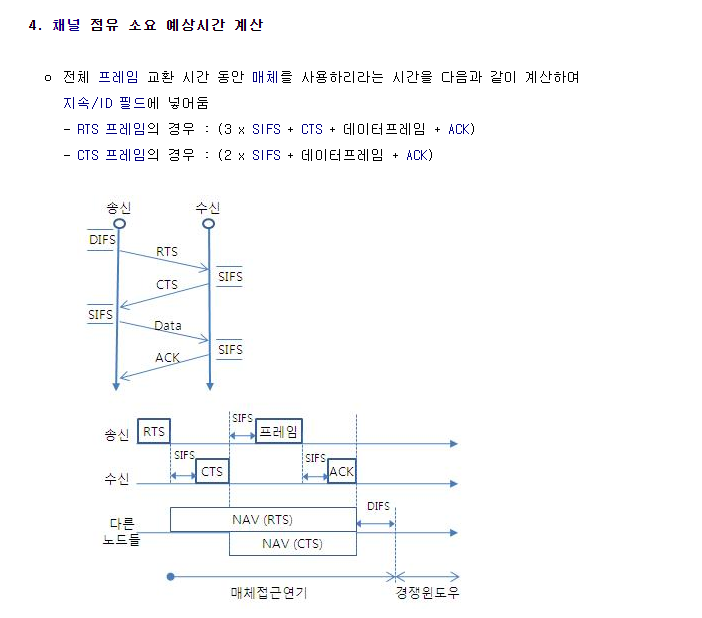 NAV : 내가 보내고자하는 프레임이 얼마시간 동안 지속되는가? 즉, 매체가 얼마 시간 동안 busy 할 것인지를 알려주는 신호. 그러면, 다른 노드들은 아 내가 이 시간동안 데이터를 보내려고하면 충돌이 일어나겠구나 인지할 수 있음.