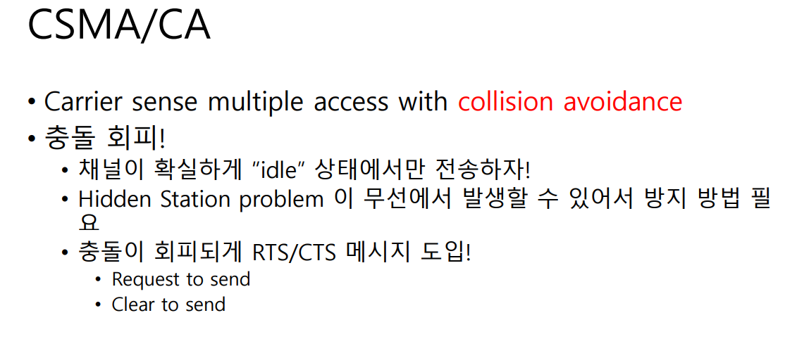 동시 송수신에서 많은 power 사용, hidden station problem, 신호 감쇄 등의 이유로 무선 연결에서는 CSMA/CD 를 사용하지 않고 CSMA/CA (Collision Avoidance) 를 사용합니다.