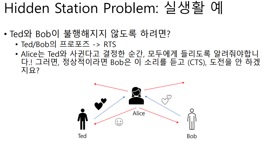 즉, Hidden Station Problem 의 상황에서 데이터 충돌이 발생하지 않도록, Alice 와 연결된 노드들 (Ted, Bob) 에 CTS 를 보냄으로써, 데이터 충돌을 회피할 수 있습니다.