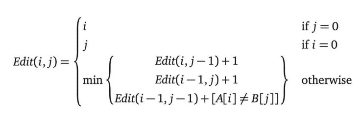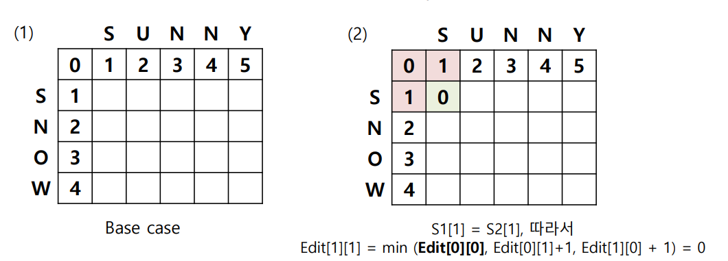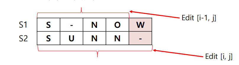 S1[i] = S1[j] -> Edit[i,j] = Edit[i-1,j-1] 또는 S1[i] != S2[j] -> Edit[i,j] = Edit[i-1,j-1] + 1