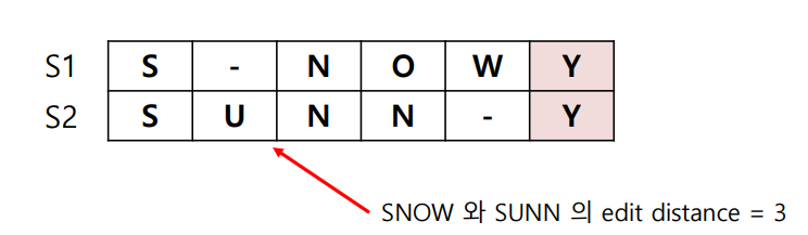 Case 2 보다 더 적은 연산 횟수로 SNOWY 를 SUNNY로 바꾸는 방법은 없으므로, SNOWY 와 SUNNY 의 edit distance 는 3이 됩니다.