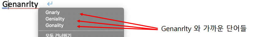 문서 편집기나, 키보드에는 다음과 같이 오타가 났을 때 수정된 단어를 추천해주는 기능이 있습니다.