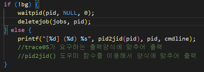 foreground job 에 대해서는 job 이 종료될 때까지 부모 프로세스(shell) 을 정지 시킨다. Foreground 로 job 이 등록될 경우, foreground job 이 종료되기 전까지 부모 프로세스(tiny shell)을 suspend 시켰다가 종료 이후 foreground job 을 제거하고, joblist 에서 foreground job 의 process id 를 제거했습니다. 즉, 자식 프로세스의 제거가 이 부분내에서 이루어졌지만, Trace 08 에서 부모 프로세스(tiny shell) 의 자식 프로세스가 종료될 때마다 발생하는 sigchld 에 대한 sigchld_handler에서 waitpid 를 통해 자식 프로세스를 모두 제거해주므로, 이 eval 함수 내의 부분을 수정해줄 필요가 있습니다. 그렇지 않으면 같은 프로세스가 종료되기까지 부모 프로세스를 정지시키고 자식 프로세스를 제거하는 작업을 중복해서 두 번 수행하므로 문제가 생길 수 있음을 예상할 수 있습니다.