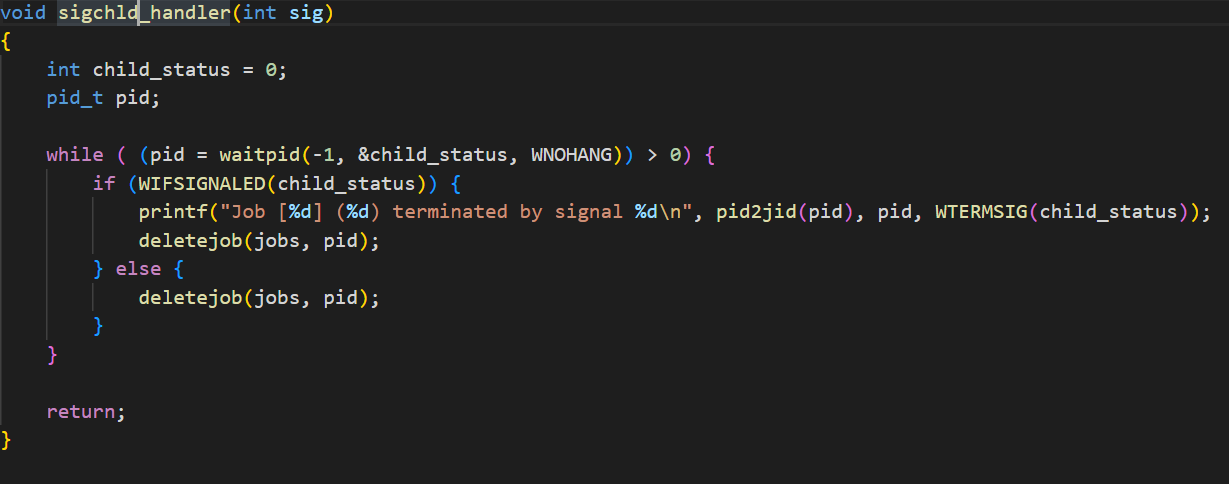 위 사항들을 구현한 sigchld_handler 의 코드는 다음과 같습니다.