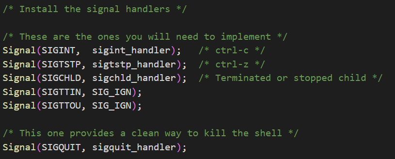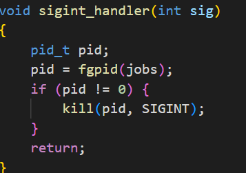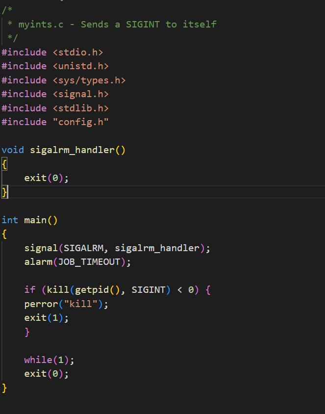 /* * myintp.c - Sends a SIGINT to its parent (the shell) * * A correctly written shell will echo the SIGINT back to the child. */ #include <stdio.h> #include <unistd.h> #include <sys/types.h> #include <signal.h> #include <stdlib.h> #include "config.h" void sigalrm_handler() { exit(0); } int main() { signal(SIGALRM, sigalrm_handler); alarm(JOB_TIMEOUT); if (kill(getppid(), SIGINT) < 0) { perror("kill"); exit(1); } while(1); exit(0); }주석을 읽어보면 shell 에 sigint 를 보낸다라고 적혀있습니다. 실제로 소스코드를 보면 main 함수에서 sigalrm을 sigalrm handler 로 제어하겠다고 signal 함수를 이용했고, alarm(job_timeout) 을 호출합니다. 그리고 부모 프로세스에 sigint signal을 송신합니다. 그 이후 while(1)에서 무한반복문을 돌며 myintp는 계속 running됩니다.