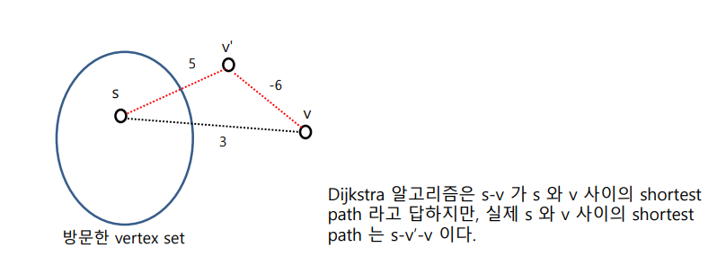 Dijkstra 알고리즘의 key lemma 는 다음과 같았습니다.Dijkstra Algorithm 에서 (아직 방문 안 한 vertex 들 중) vertex s 에서부터의 shrotest path 길이가 가장 짧은 vertex 를 v라 하면 그 길이는 실제 s에서 v로의 shortest path 길이와 같다. 위 key lemma 는 weight 가 negative 인 edge 가 존재할 경우 성립하지 않습니다. 그 이유는 다음과 같습니다.