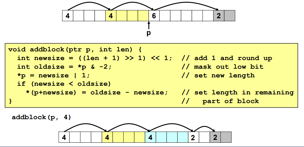 void addblock 코드를 자세히 살펴봅시다. void addblock(ptr p, int len) 을 살펴봅시다. newsize 에 len+1을 2의 제곱 단위로 반올림합니다. 그리고 oldsize 에 가용블록의 Header 부분에 저장된 정보 (Blocksize, Allocated) 와 -2를 & 연산을 통해 masking 함으로써, blocksize 를 저장할 수 있습니다. 새로, *p의 헤더에 newsize, Allocated 정보를 저장해주고, 만약 newsize 가 oldsize보다 작다면, newsize 이후 남는 블록은 oldsize - newsize 의 blocksize를 갖는 가용 블록 (free) 으로 표시해줄 수 있도록 *(p+newsize) = oldsize - newsize 를 수행합니다.