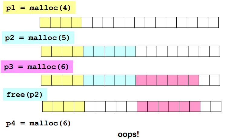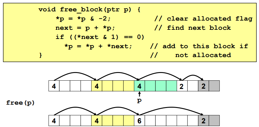 free block size는 6이 되어야하는데, 4와 2로 단편화 됩니다. 단순하게 Allocated 정보를 0으로 set 해주는 경우 (void free_block(ptr p) { *p = *p & -2 }) free(p) 이후, 가용 블럭의 크기는 6이 되어야 하지만, 4와 2로 단편화 됩니다. 즉, 가용 공간이 있음에도 불구하고, Memory Allocator 는 할당할 블록을 찾지 못합니다.