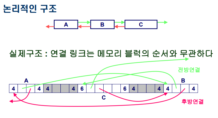 직접 리스트 방식을 이용하는 경우에, 가용블럭들만 관리하면 되므로, 추가적인 워드의 소모없이 가용블럭의 payload 영역을 이용하여, preceed block 과 succeed block을 저장할 수 있습니다. 다음 그림을 통해 이해해봅시다.