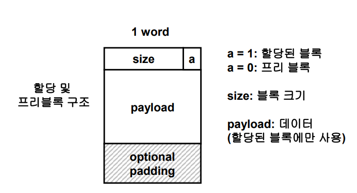 매 할당 블록마다 추가적으로 1워드가 소요됩니다. 그리고 free 시에 이 header 도 같이 free 해주어야합니다.