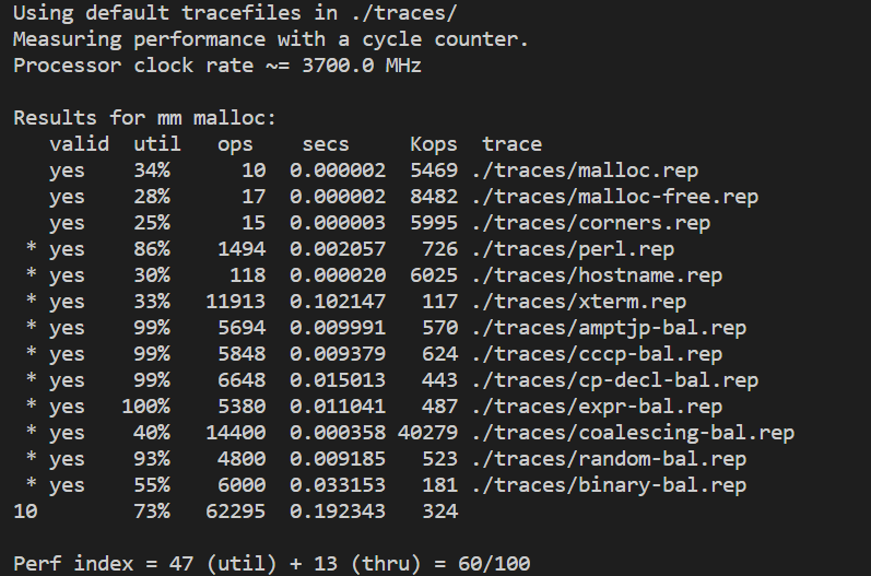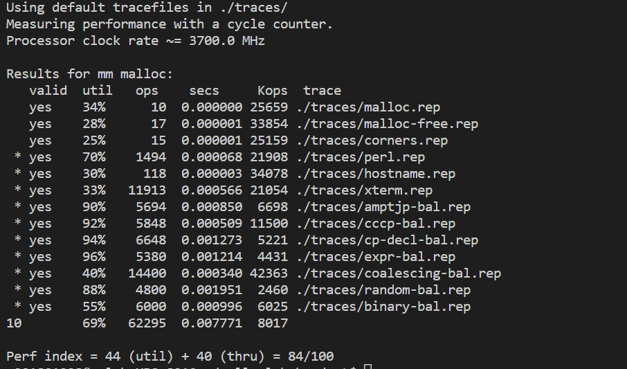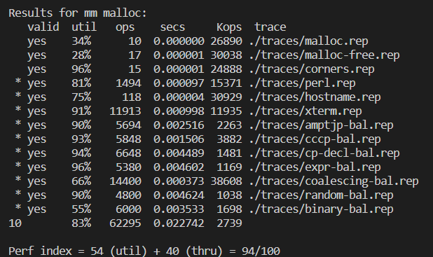 static void *coalesce(void *bp){ size_t prev_alloc = GET_ALLOC(FTRP(PREV_BLKP(bp))); // allocation status of previous block size_t next_alloc = GET_ALLOC(HDRP(NEXT_BLKP(bp))); // allocation status of next block size_t size = GET_SIZE(HDRP(bp)); if (prev_alloc && next_alloc){ // If two blocks are allocated already, return bp CASE 1 previous_heap_listp = bp; // for next fit return bp; } else if (prev_alloc && !next_alloc){ // If next block is free block, return extended block CASE 2 size += GET_SIZE(HDRP(NEXT_BLKP(bp))); PUT(HDRP(bp),PACK(size,0)); PUT(FTRP(bp), PACK(size,0)); } else if(!prev_alloc && next_alloc){ // If previous block is free block, return extended block CASE 3 size+= GET_SIZE(HDRP(PREV_BLKP(bp))); PUT(FTRP(bp), PACK(size,0)); PUT(HDRP(PREV_BLKP(bp)), PACK(size,0)); bp = PREV_BLKP(bp); } else { // If two blocks are free block, return extended block CASE 4 size+= GET_SIZE(HDRP(PREV_BLKP(bp))) + GET_SIZE(FTRP(NEXT_BLKP(bp))); PUT(HDRP(PREV_BLKP(bp)), PACK(size,0)); PUT(FTRP(NEXT_BLKP(bp)), PACK(size,0)); bp = PREV_BLKP(bp); } previous_heap_listp = bp; // for next fit return bp; }Next Fit 을 통해 malloc free 를 구현했을 때 얻을 수 있는 점수는 다음과 같습니다.