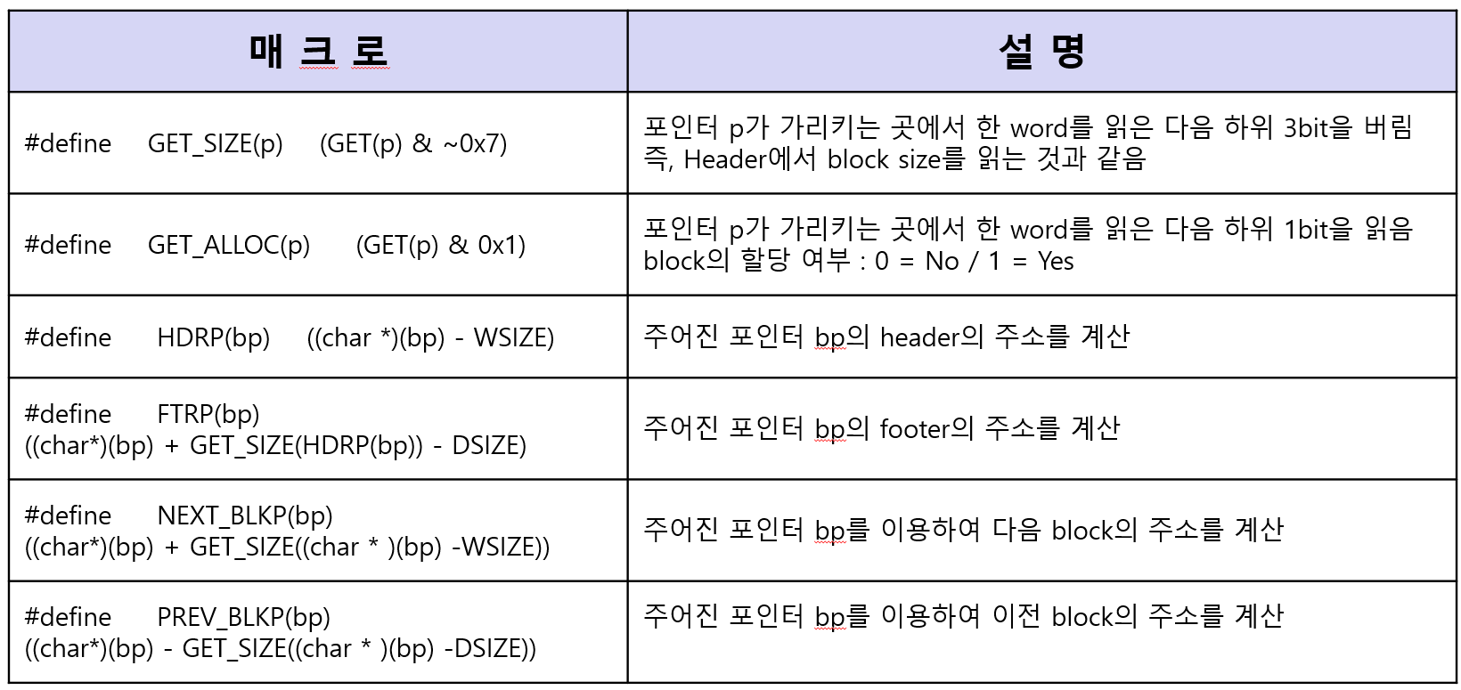 간접 리스트 방식으로 구현하기에 앞서 Malloc / Free 를 구현할 때 유용한 매크로 변수, 매크로 함수, 메소드 들에 대한 설명을 첨부합니다.